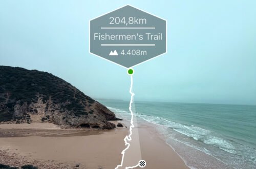 Am VP habe ich ein Date. Robert will mich auf den verbleibenden Kilometern begleiten. Im Näherkommen kann ich allerdings niemanden ausmachen, außer die Freiwilligen, die mich über den Stand des Rennens informieren. Sechzehnter soll ich sein, eine Frau liegt ebenfalls vor mir. Das verwirrt mich. Meine Annahme war, dass Teresa die Führung des Frauenfeldes innehat oder zumindest hatte, bis sich unsere Wege trennten. Ich stammle: „Sehr gut“, und beende meinen Boxenstopp mit einigen Schlucken Cola und gefüllten Flaschen. Direkt am VP ist ein Kilometerschild aufgestellt: 44,5 km. Meine Uhr hat gerade 44 km signalisiert. Ab jetzt ziehe ich von der Restdistanz also immer einen halben Kilometer ab, sehr erfreulich. So sind es etwas weniger als 16 km bis ins Ziel. Das kann ich mir gut vorstellen, weil es weniger ist als meine üblichen Trainingsrunden.